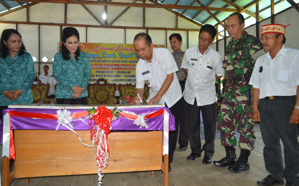 Peresmian tersebut ditandai dengan pengguntingan pita dan penandatanganan prasasti hasil pembangunan di Desa Sei Kayu seperti pasar desa, balai serba guna dan rumah PAUD oleh Bupati Kapuas.
