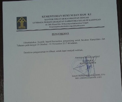 Isi dari pengumuman tersebut menyapaikan bahwa kepada bapak/ibu/saudara pengunjung untuk besukan narapidana dan tahanan pada tanggal 30 sampai dengan 1 november ditiadakan.
