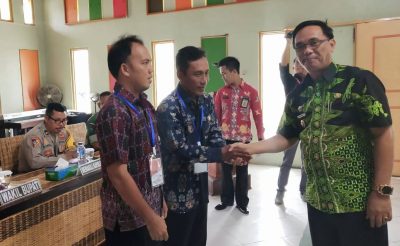 BERJABAT TANGAN : Wakil Bupati Sunardi N.T Litang usai memasangkan secara simboli tanda peserta kegiatan Deteksi Dini Untuk Unsur Pemerintahan Se-Kabupaten, Jumat (29/3/2019).