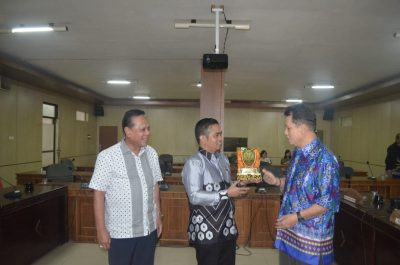 PLAKAT : Anggota DPRD Bartim Gomelson Lazarus (kanan), saat bertukar plangkat, disela kunjungan DPRD Kabupaten HSU Provinsi Kalsel, Jumat (12/4/2019).