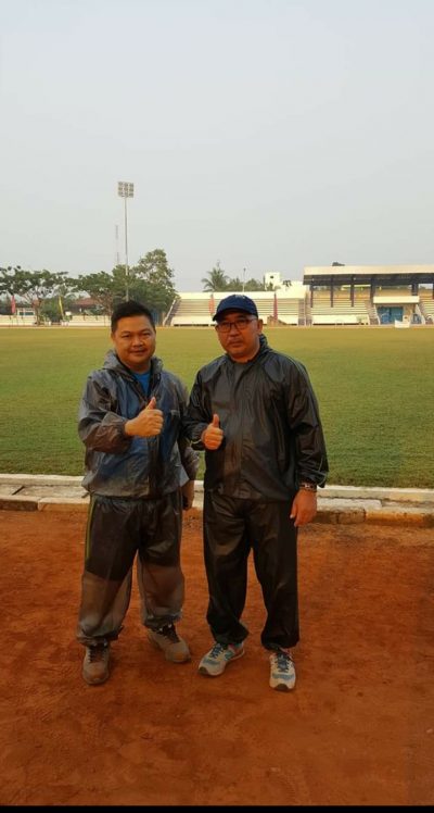 AKTIVITAS : Ketua DPRD Batara, Set Enus Y Mebas (kiri) dan rekannya H Abri melakukan aktivitas olahraga bersama di Stadion Swakarya Muara Teweh, kemarin (13/8/2019).