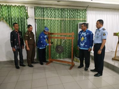 MENABUH : Asisten III Setda Pulpis, Susilo I Tamim menabuh gong saat membuka rapat di Aula Mess Pemda, Kamis (10/10/2019).
