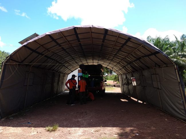 FOTO : Tampak tenda bantuan dari BPBD Kotawaringin Timur sudah terpasang untuk warga korban banjir Desa Bajarau.
