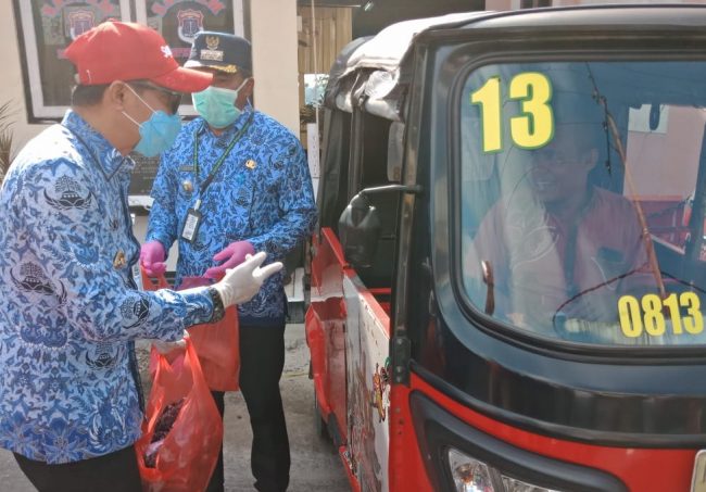 PEDULI : Bupati Kotim, Supian Hadi langsung turun tangan memberikan masker kepada masyarakat.