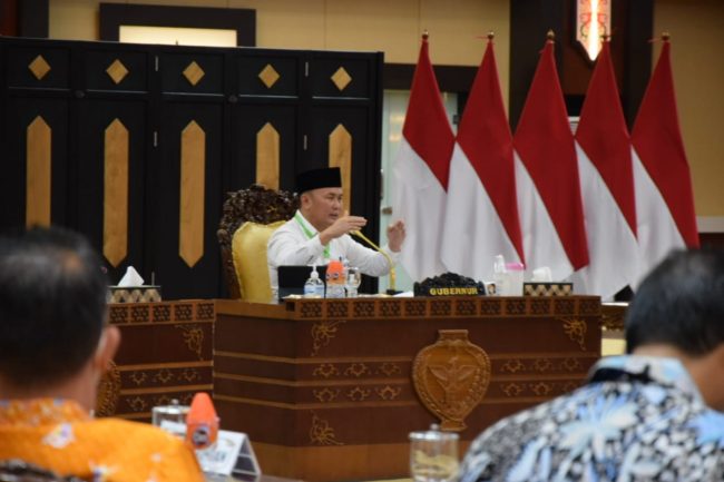 FOTO : Gubernur Kalteng, H. Sugianto Sabran ketika pimpin Rakor membahas Inflasi dan Pertumbuhan Ekonomi serta Penyerapan Anggaran Tahun 2020 di aula Jayang Tingang kantor gubernur setempat, Sabtu (18/7/2020).
