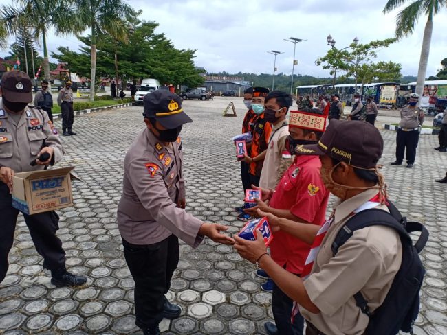 FOTO : Kapolres Gunung Mas, AKBP Rudi Asriman ketika menyerahkan bantuan masker kepada anggota Pramuka, Kamis (30/7/2020).