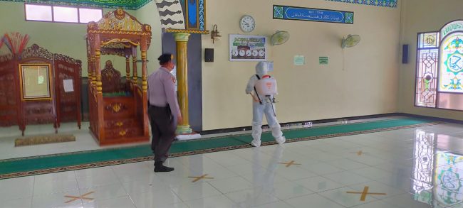 FOTO : Personel Polsek Rungan ketika sterilisasi rumah ibadah dengan menyemprot cairan disinfektan di Masjid Shiratal Mustaqim Desa Tumbang Jutuh, Kamis (30/7/2020).