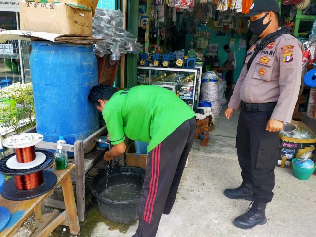 FOTO : Personel Polsek Kurun saat mengimbau masyarakat mencuci tangan terlebih dahulu sebelum mulai aktifitas perdagangan, Jumat (21/8/2020).