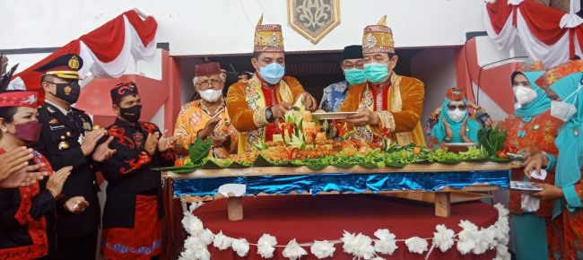 TUMPENG : Bupati Kotim, H. Supian Hadi dan Wakil Bupati HM.Taufik Mukri saat memotong tumpeng saat perayaan HUT Kabupaten Kotim ke 68, Kamis (7/12/2021).