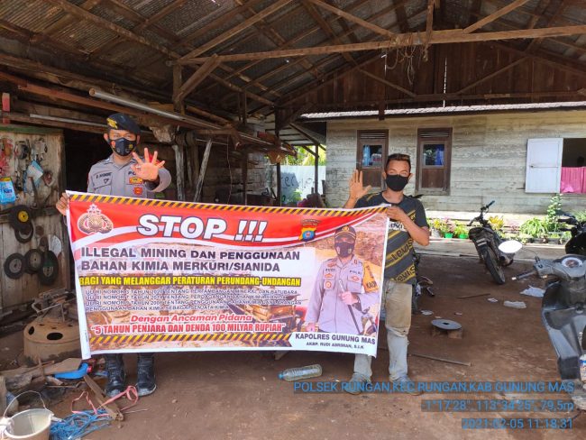faktakalimantan.co.id – KUALA KURUN – Polsek Rungan, Polres Gunung Mas (Gumas), Polda Kalteng melaksanakan kegiatan Sosialisasi Illegal Mining dan Penggunaan Bahan Kimia Merkuri/Sianida dengan menggunakan media Spanduk di wilayah hukumnya. Jumat (5/2/2021) pagi.