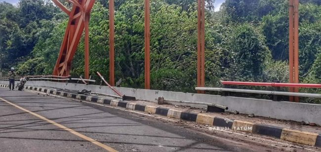 FOTO : Nampak pipa pagar jembatan Batu Mahasur rusak parah usai dihantam bodi eksavator yang sedang diangkut truk, Rabu (24/2/2021).