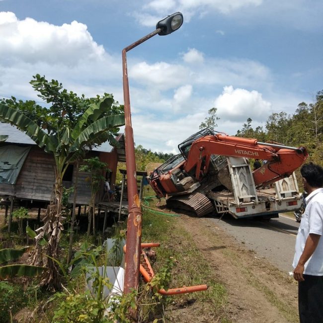 Diduga Rem Blong, Truk Muatan Eksavator Tabrak Jembatan Batu Mahasur