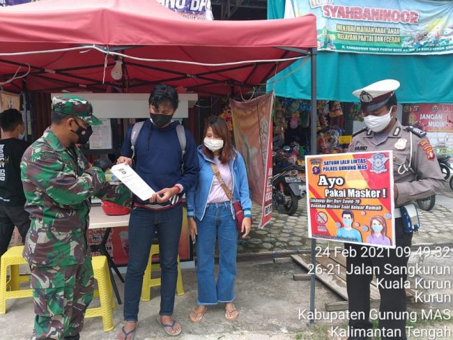 faktakalimantan.co.id – KUALA KURUN – Personel Satlantas Polres Gunung Mas gencar mengajak masyarakat dalam hal ini pengendara agar selalu menerapkan protokol kesehatan dalam mencegah penularan Covid-19 melalui sosialisasi 3M (Menggunakan masker, Mencuci tangan pakai sabun, Menjaga jarak fisik).