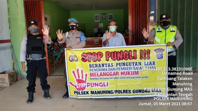 faktakalimantan.co.id – KUALA KURUN – Dalam upaya mencegah terjadinya pungutan liar atau pungli di wilayah Kecamatan Manuhing oleh oknum yang tidak bertanggung jawab, Personel Polsek Manuhing jajaran Polres Gunung Mas (Gumas), Polda Kalteng, turun ketengah masyarakat untuk memberikan Sosialisasi mengenai Saber Pungli, Jum’at (05/03/2021) Siang.