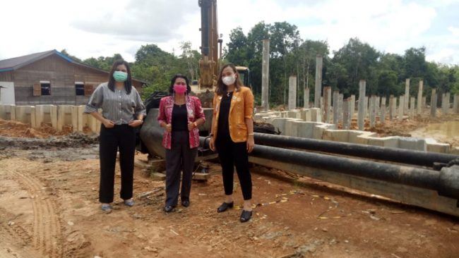 TINJAU : Anggota DPRD Kabupaten Gumas Rayaniatie Djangkan (batik merah), bersama koleganya Dewi Sari dan Yuniwa, saat meninjau lokasi pembangunan Pile Slab menuju oprit jembatan Sei Kahayan di Desa Sepang Kota, Kecamatan Sepang.