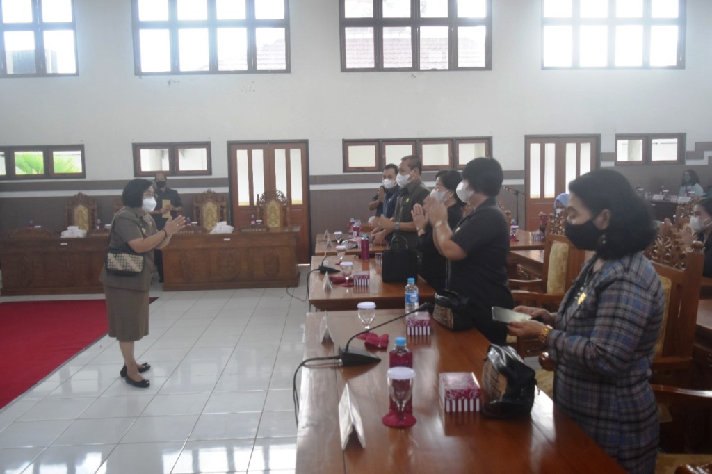 MENYAPA : Wakil Bupati Gumas Efrensia LP Umbing menyapa para anggota legislatif usai pelaksanaan rapat paripurna DPRD setempat.