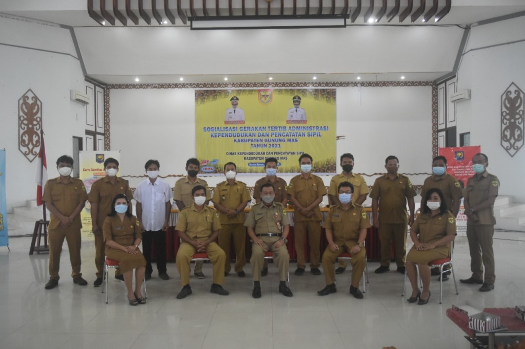 FOTO : Sekda Gunung Mas, Yansiterson saat foto bersama usai kegiatan sosialisasikan gerakan administrasi kependudukan Kabupaten Gunung Mas tahun 2021 di GPU Damang Batu, Selasa (15/6/2021).