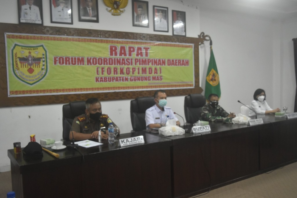 faktakalimantan.co.id – Kuala Kurun – Bupati Gunung Mas Jaya, Samaya Monong memimpin rapat Forum Koordinasi Pimpinan Daerah (Forkopimda) di ruang rapat lantai 1 Kantor Bupati, Rabu (1/9/2021).