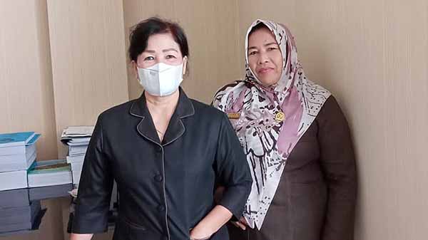 FOTO : Anggota DPRD Kabupaten Gumas, Lily Rusnikasi bersama Siti Hilimiah saat berfoto di ruang kantor dewan setempat, Selasa (28/9/2021).