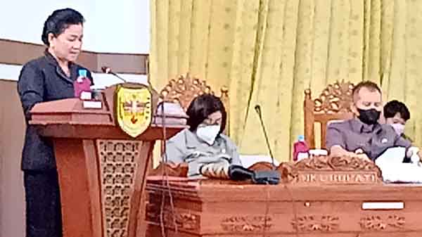 FOTO : Anggota DPRD Gumas, Lily Rusnikasi sedang menyampaikan pandangan umumnya di hadapan anggota legislatif, yudikatif dan eksekutif di kantor dewan Gumas, Selasa (9/11/2021).
