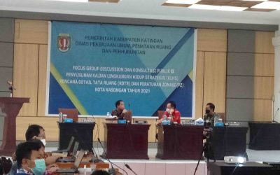 Kasongan – Bupati Katingan Sakariyas bersama pihak dinas terkait seperti Kepala Dinas Pekerjaan Umum, Christian Rain, Kepala Dinas Lingkungan Hidup atau DLH Hap Bapperdo dan lainnnya menghadiri focus group discussion dan konsultasi publim II penyusunan kajian lingkungan hidup strategis atau KLHS rencana detail tata ruang atau RDTR dan peraturan zonasi Kota Kasongan di Aula Bappelitbang, Kamis, (18/11 2021)