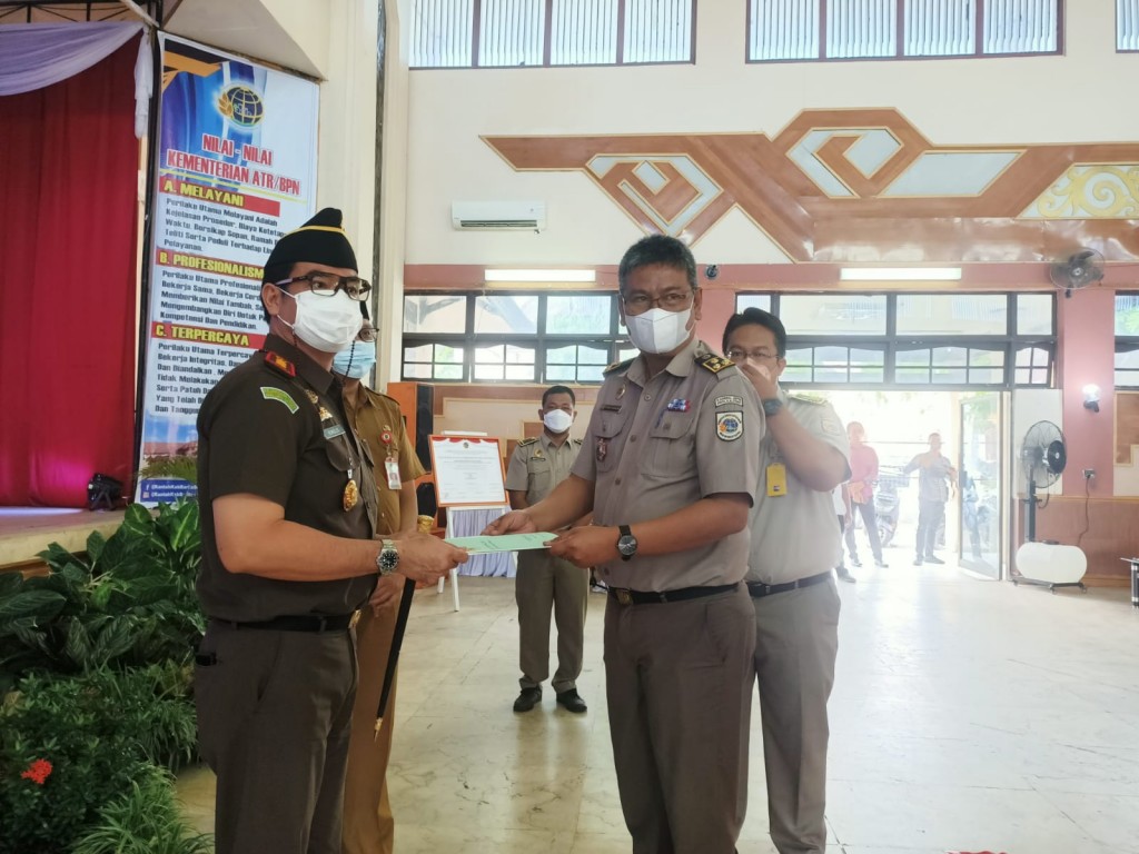 Foto : Kepala Tata Usaha Kantor ATR/BPN Kalteng, Ferri Saragih saat menyerahkan sertifikat aset kepada pemerintah daerah Barsel dan Kejari Barsel, Selasa (21/12/2021).