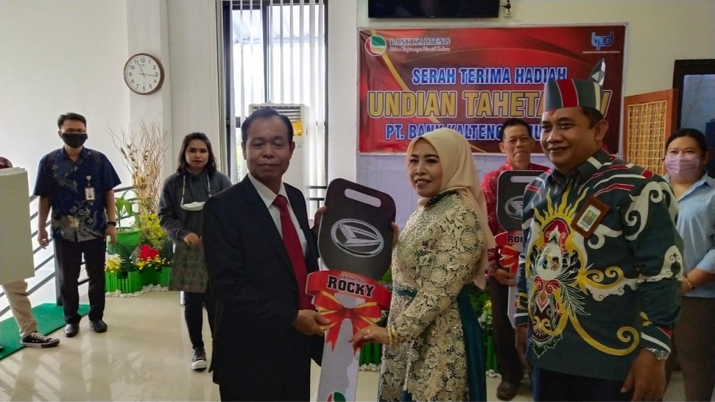 faktakalimantan.co.id – KASONGAN – Bupati Katingan Sakariyas didampingi Pimpinan Bank Cabang Kasongan Empas S Umar, secara simbolis menyerahkan hadiah utama duah buah mobil Daihatsu Rocky kepada dua orang warga Katingan atau nasabah hasil dari undian program Tabungan Hari Esok Terencana (Taheta) ke 25 PT Bank Kalteng tahun 2021, di aula lantai II Bank Kalteng Cabang Kasongan, Kamis 27 Januari 2022.