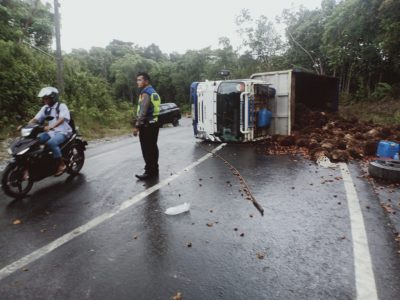 KECELAKAAN: Anggota Satlantas Polres Gumas sedang mengatur lalulintas di tempat insiden kecelakaan di Desa Dahian Tambuk, Selasa (13/9/2022).