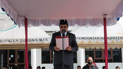 SAMBUTAN: Ketua DPRD Kabupaten Gumas, Akerman Sahidar sedang membacakan sambutannya saat apel hari pahlawan di depan kantor bupati setempat, Kamis (10/11/2022).