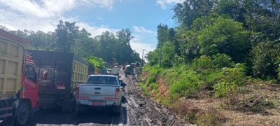 RUSAK: Tampak Jalan Kurun Palangka Raya rusak parah dilalui truk bermuatan sedang antrian di jalan wilayah Desa Rabauh, Sabtu (18/11/2022).