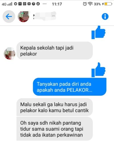 “NT menghina, memfitnah dan mencemarkan nama baik saya melalui pesan di FB. Terlebih menyebut saya sebagai Kepala Sekolah Pelakor yang artinya dia juga menghina jabatan saya di instansi. Laporan juga akan saya kirimkan ke PGRI agar permasalahan ini dapat diproses sebagaimana mestinya” pungkas ST.
