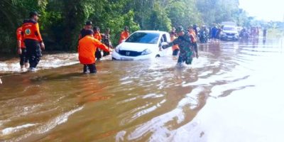 Foto : Direndam banjir setinggi dada orang dewasa, jalan raya Buntok – Palangka Raya di ruas desa Lembeng macet.